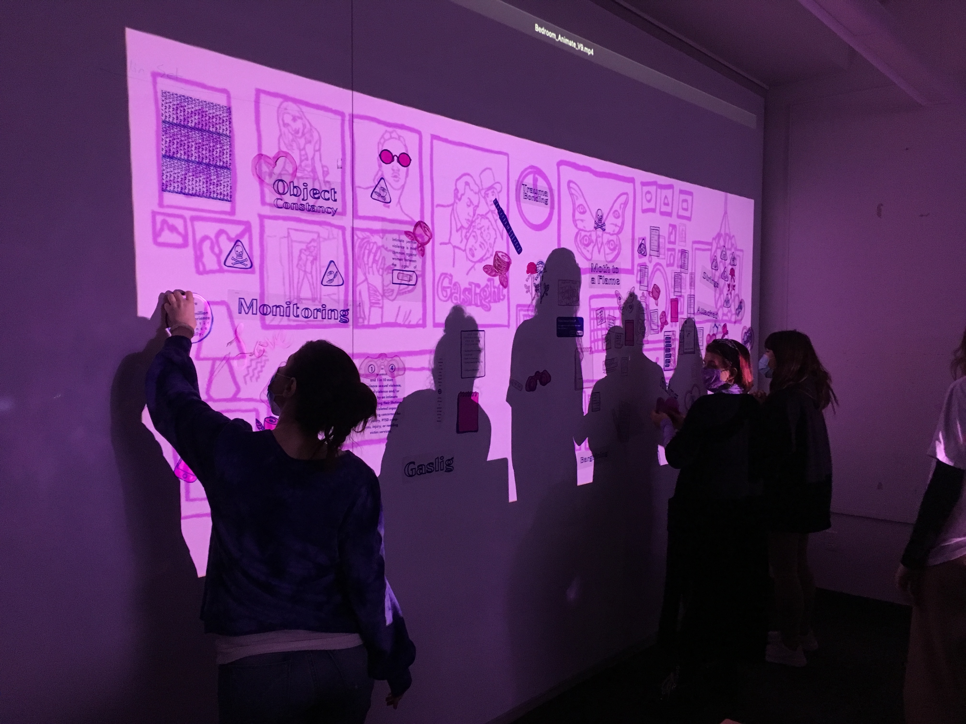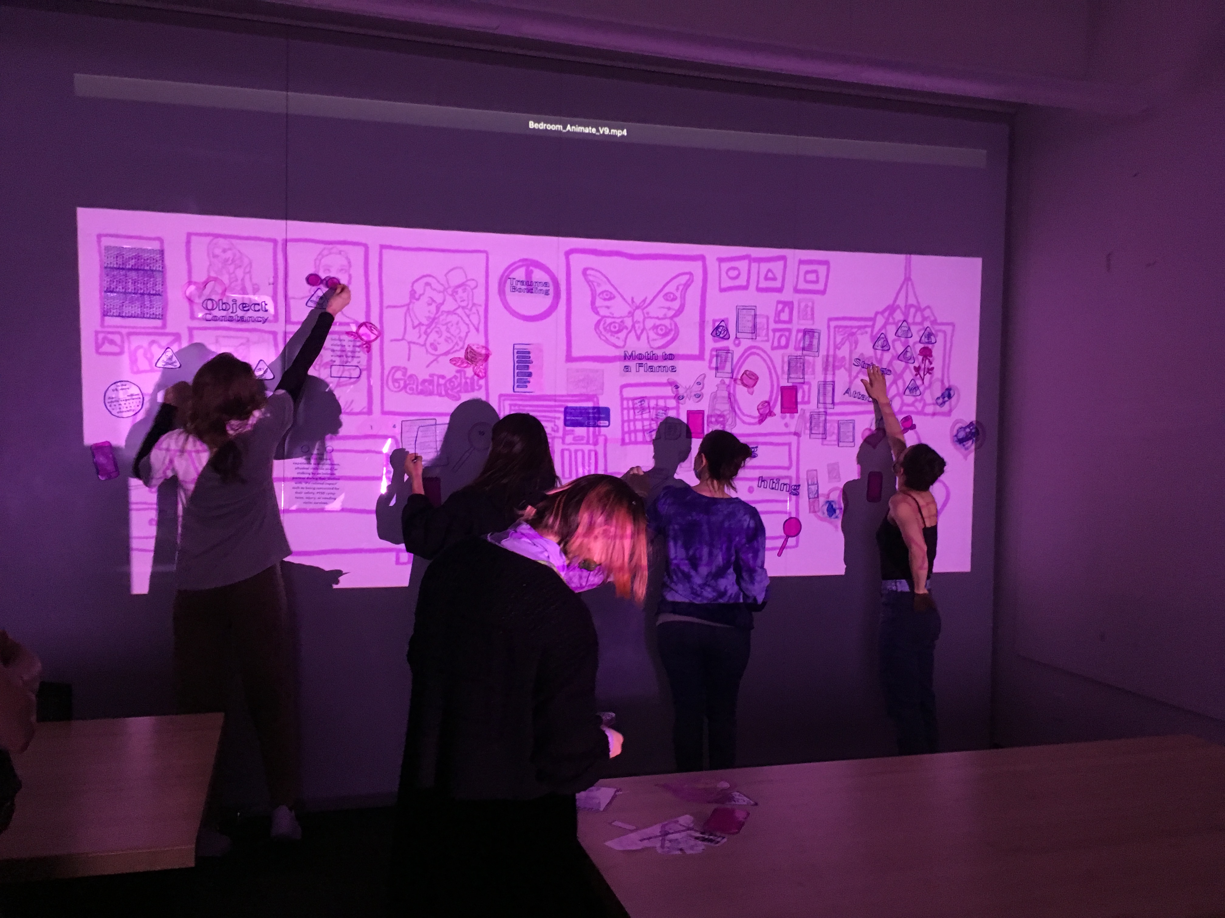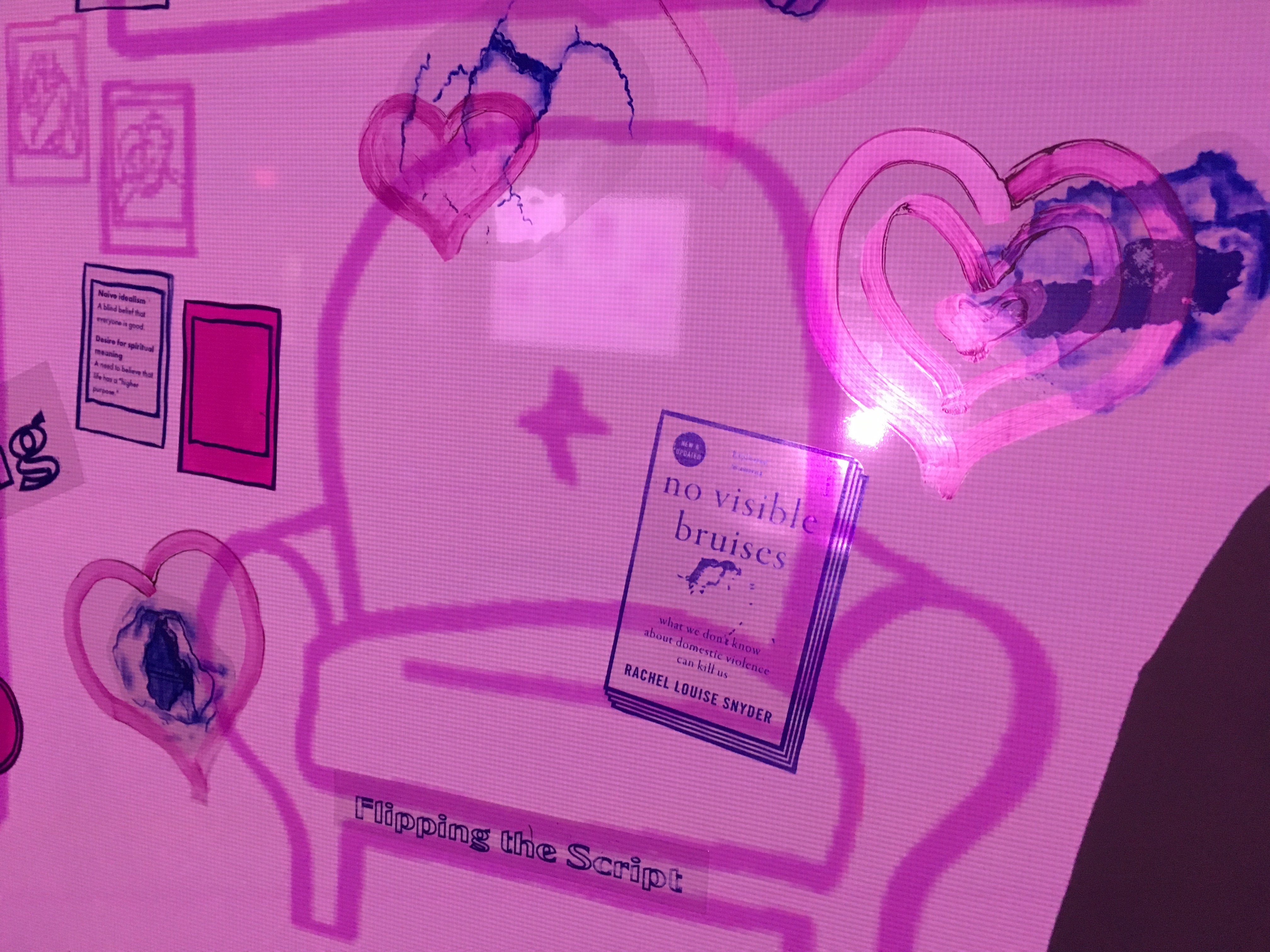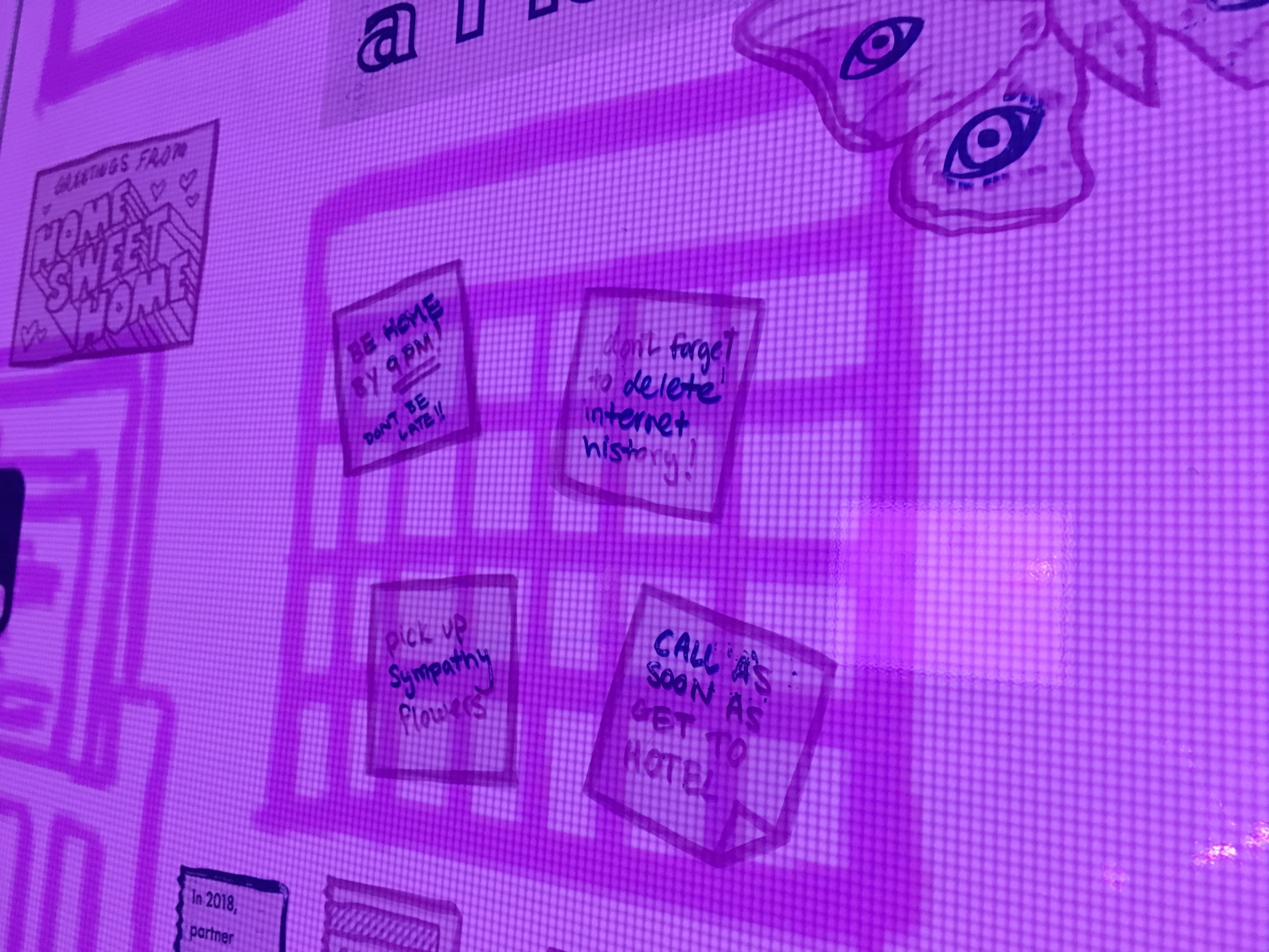 A scene of a teenage girl’s room. The interior space of someone's safe space and a representation of their mindset. Yet, this room isn't as safe as you think. By looking through the rose-colored glasses and lens, the pretty pink world starts to dissolve and blue cracks begin to appear: holes in the drywall, warning signs in text messages, sticky note reminders.